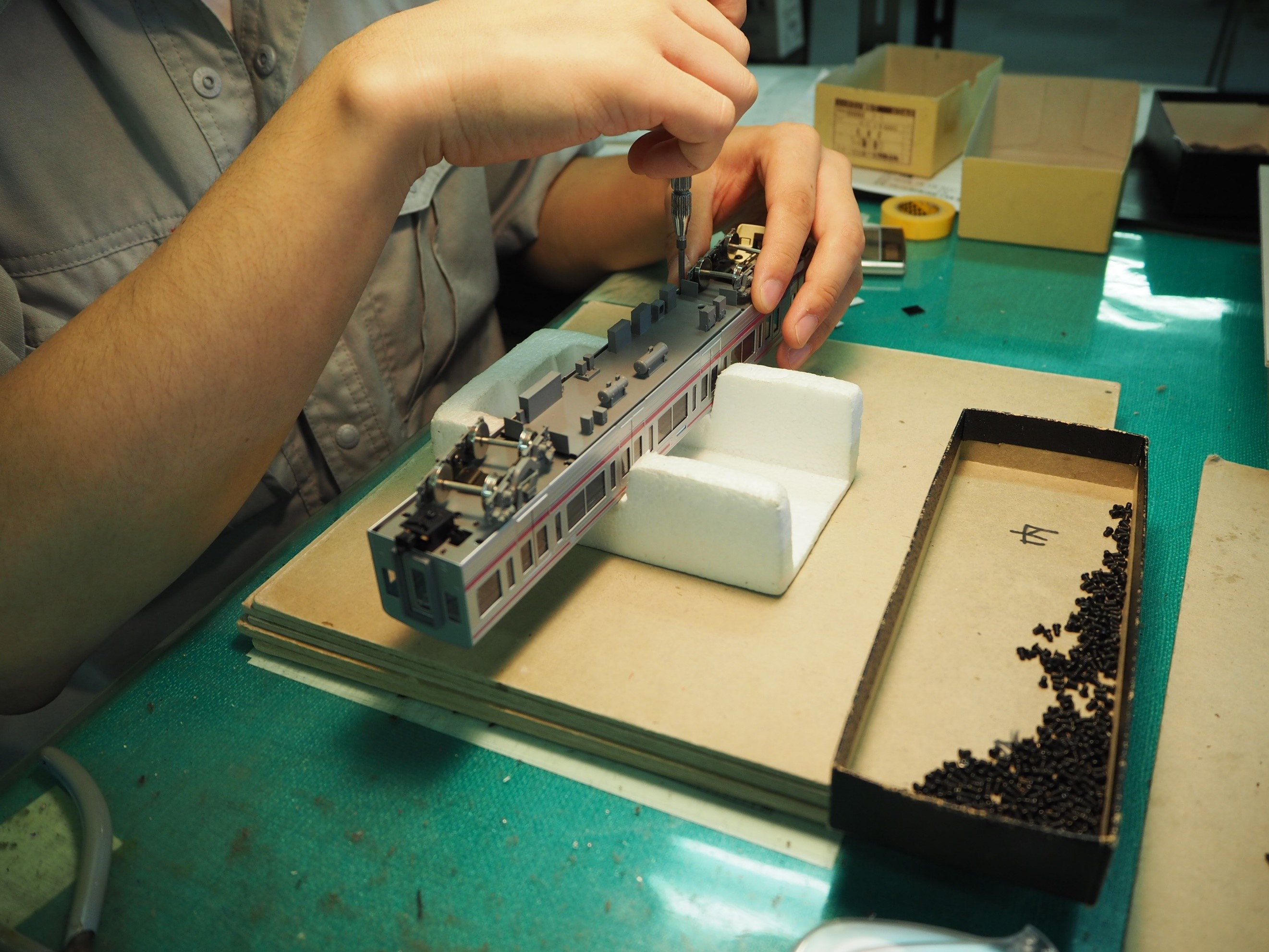 当社の強みは、実物の各国内鉄道車両図面より1/80に縮尺した設計図の作成~金型製造~主に真鍮板のプレス加工(切断・曲げ加工等)~半田付け~塗装・特殊印刷~組立といった各工程での熟練の技術者による緻密且つ精密な製造工程を経て生み出された唯一無二のものづくり集団です。