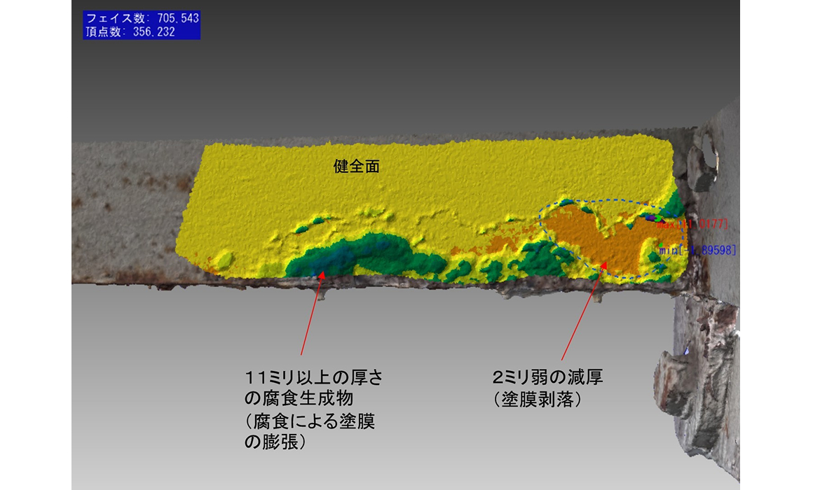 鋼材腐食やコンクリート面の凹凸など、表面状態が本来の形状から変化した状態を精密に三次元計測し、変化分を可視化します。
